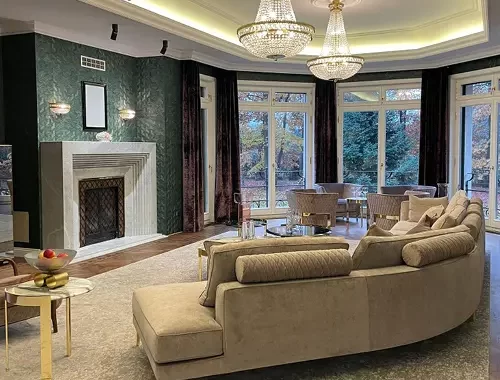 Per la suggestiva veranda che si affaccia sul giardino con vista mare, il salotto componibile Simon cattura l’attenzione grazie all’utilizzo di pregiato velluto bordeaux per il suo raffinato rivestimento capitonné esterno. A completamento dell’ambiente, i tavolini Amos in due diverse dimensioni, insieme alla console retro divano Isabel, aggiungono dettagli lussuosi e funzionali che completano l’atmosfera.